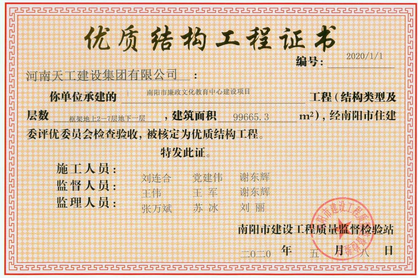 省工程建設協(xié)會評價審定為河南省工程建設優(yōu)質(zhì)結構工程