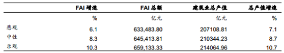 我們依然利用線性回歸對 2017 年的行業(yè)增長做出預測, 悲觀情況下, 如果 FAI增速下滑到 6.1%,則建筑業(yè)總產(chǎn)值增速為 7.1%,中性情況下,F(xiàn)AI 增速為 8.1%,則建筑業(yè)總產(chǎn)值增速為 8.7%, 樂觀情況下, 如果 FAI 增速回升至 10.3%, 則行業(yè)增速將回升至 10.7%。從模型的結(jié)果來看, 行業(yè)增速開始高于 FAI 增速, FAI 對行業(yè)的拉動作用出現(xiàn)上升, 我們認為主要還是由于 FAI 的結(jié)構(gòu)變化, 基建和房地產(chǎn)作為對建筑業(yè)拉動較大的板塊, 在 FAI 中的占比的提高。